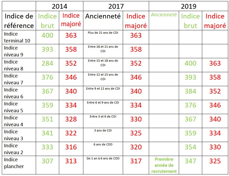 Quant à la carrière, il est bon de se rappeler qu’en 2014 la grille indiciaire comportait dix échelons, qu’elle en a perdu un en 2017 et qu’elle ne comporte plus que huit depuis juin 2019.