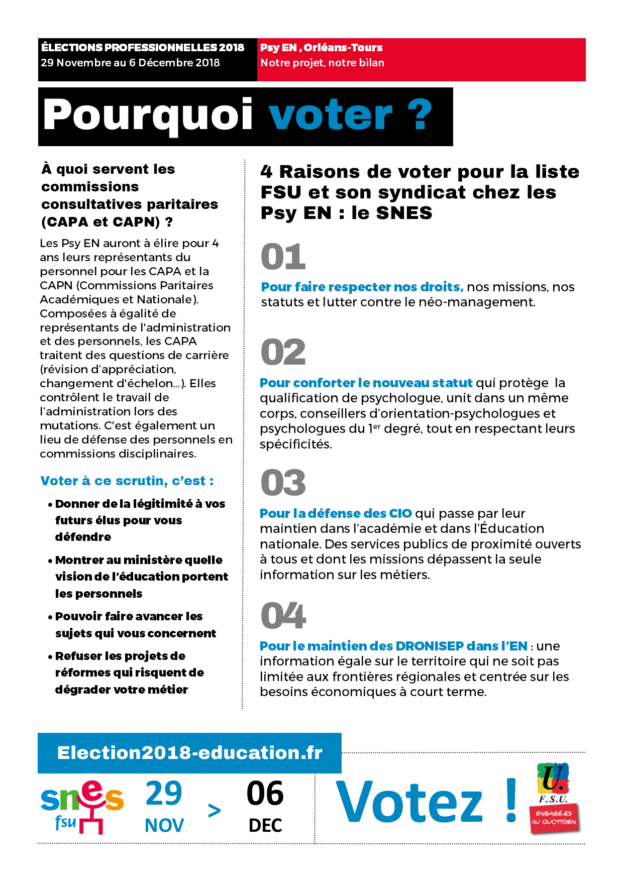 Vous êtes ici : Accueil Le SNES-FSU et vous Elections professionnelles 2018 CAPA PSY-EN 4 raisons de voter PsyEN 22 octobre 2018 Le SNES-FSU et vous 4 raisons de voter PsyEN Partager cet article :
