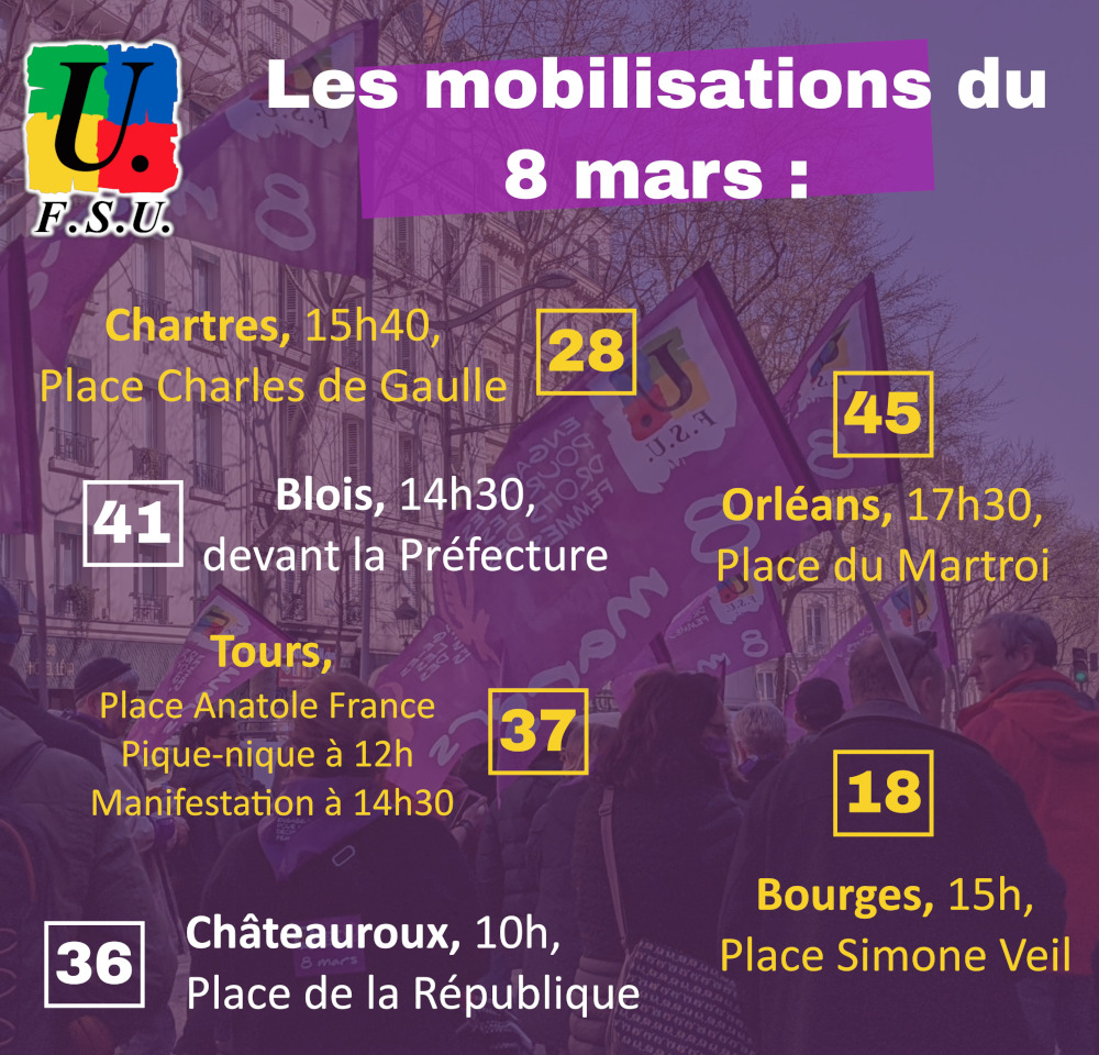 Salaires, retraites, violences sexistes et sexuelles, solidarité avec les femmes du monde entier, la FSU appelle les collègues à se mettre en grève et à se mobiliser pour obtenir des droits nouveaux pour les femmes et enfin l’égalité salariale (qui permettrait de renflouer les caisses de retraites de plus de 5,5 milliards d’euros) .