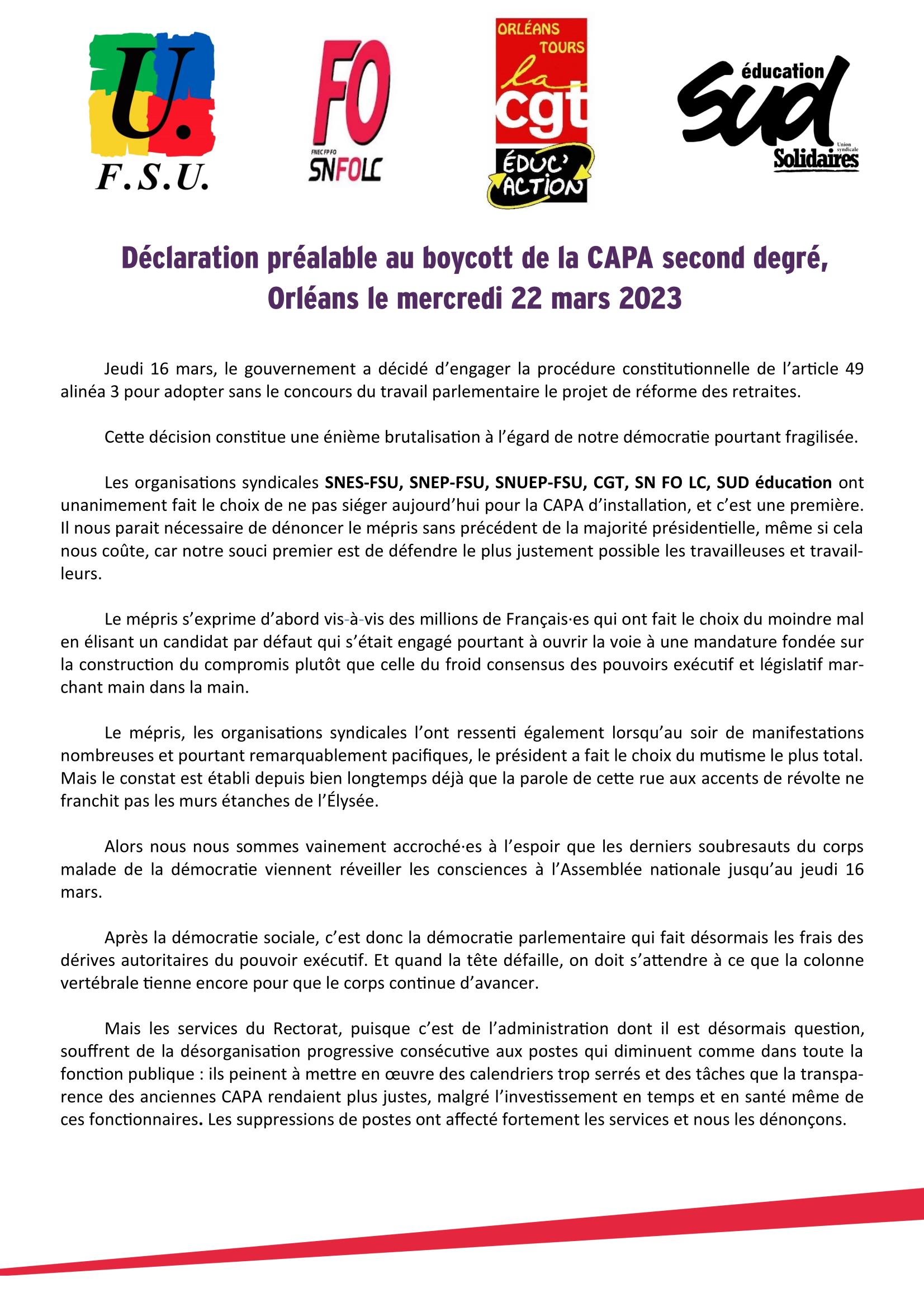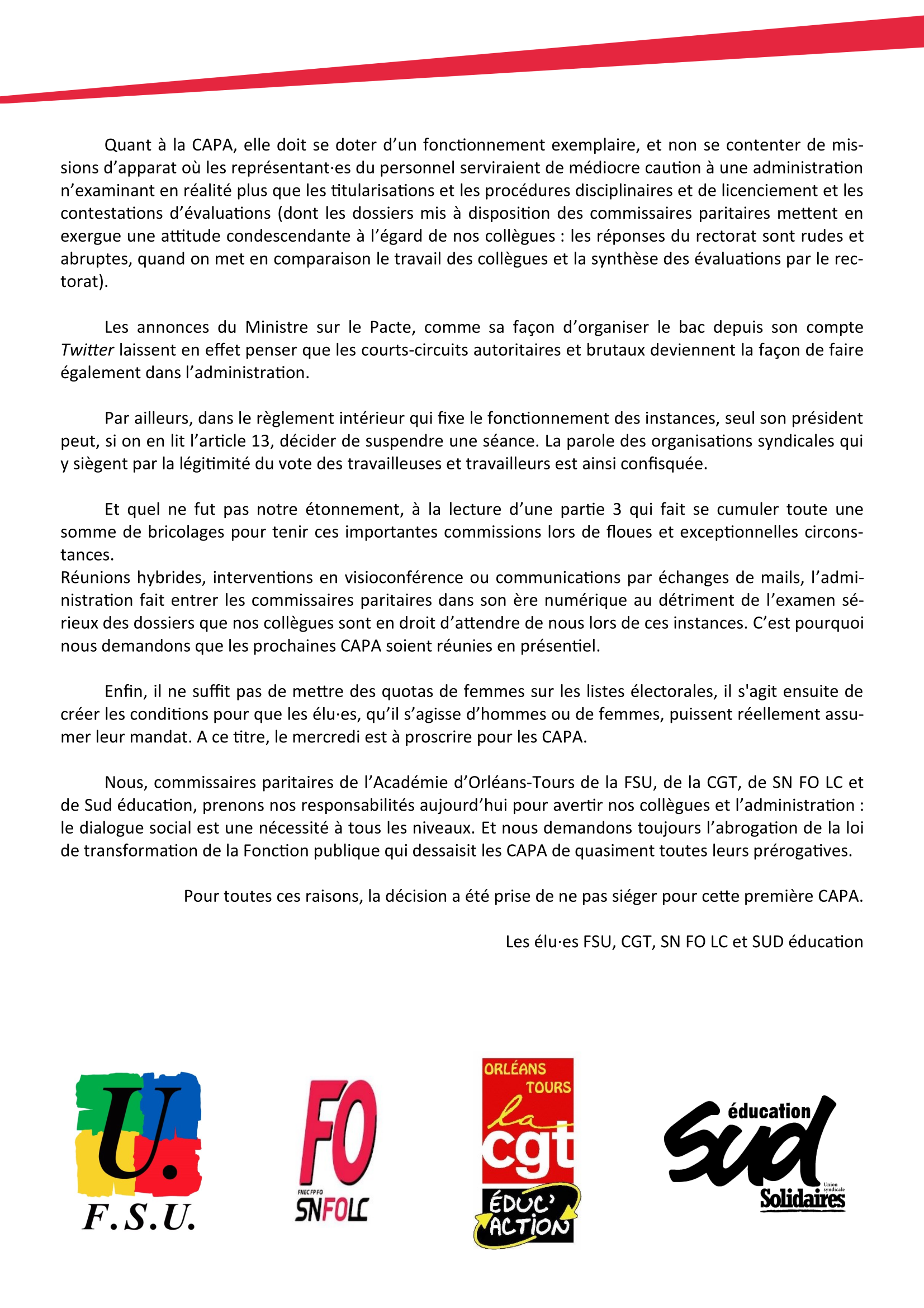 Cette CAPA compte 19 commissaires paritaires, il y a également le SNALC (2), l’UNSA (2) et la CFDT (1) qui n’ont pas souhaité participer à cette action.