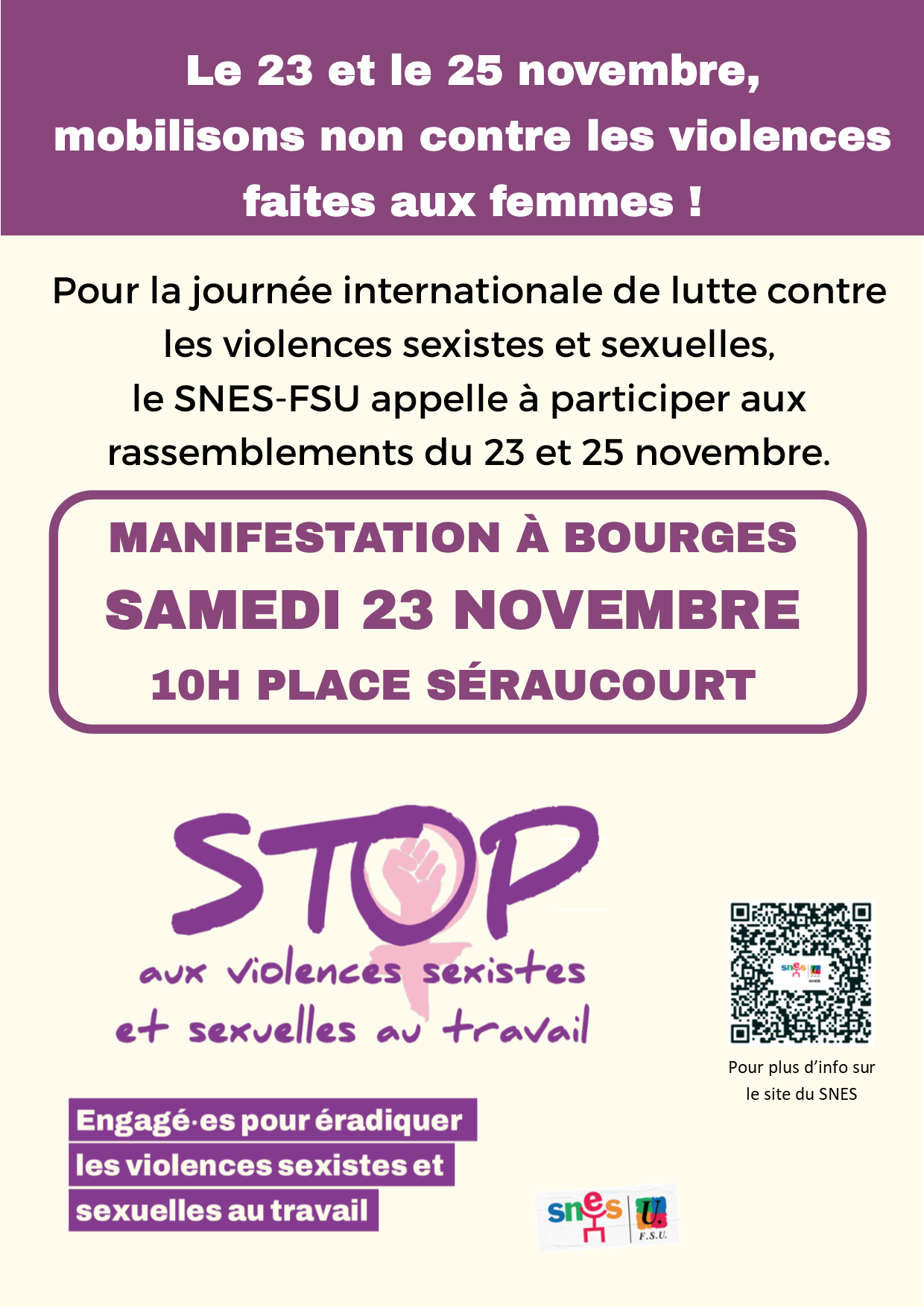 Dans le cadre de la journée international de lutte contre les violences faites aux femmes, la FSU appelle à participer au rassemblement initié par le planning familial du Cher. Rendez-vous à 10h place Séraucourt.