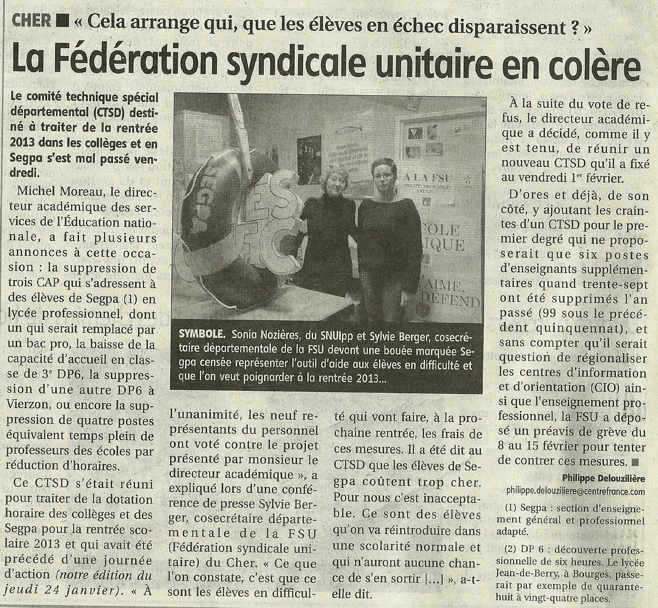 Vous êtes ici : Accueil Actualités académiques Politiques scolaires Comité Social d’Admlinistration Spécial Départemental (CSA SD) CR du CTSD du Cher du 25/01/2013 29 janvier 2013 Actualités académiques CR du CTSD du Cher du 25/01/2013 Partager cet article : Le CTSD sur le rentrée 2013 des collèges du Cher s’est tenu le vendredi 25 janvier. Voici la déclaration de la FSU et les réponses du DASEN, ainsi que nos commentaires... Conf de presse du 25/01/2013