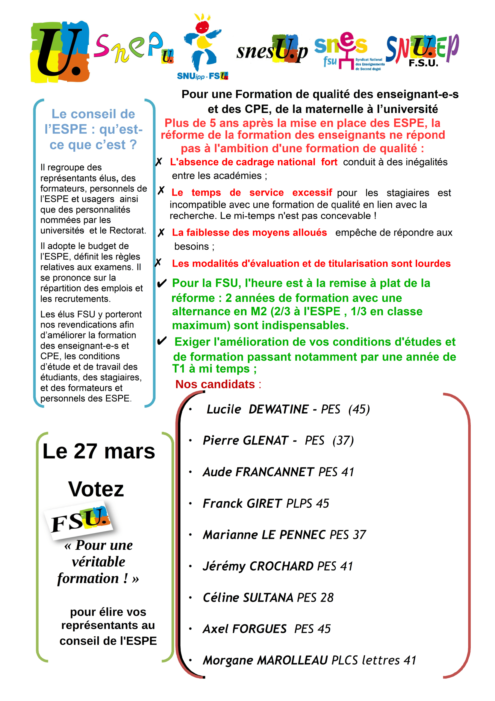 Vous êtes ici : Accueil Entrée dans le métier Connaître ses droits Election Conseil de l’Ecole de l’ESPE 9 novembre 2018 Entrée dans le métier Election Conseil de l’Ecole de l’ESPE Partager cet article : Chèr.e.s adhérents stagiaires, Vous trouverez ci-joint la profession de foi de la FSU qui a été utilisée lors de l’élection précédente. Nous vous en souhaitons bonne lecture. Pour le SNES-FSU ORLEANS-TOURS, Eric RIOU