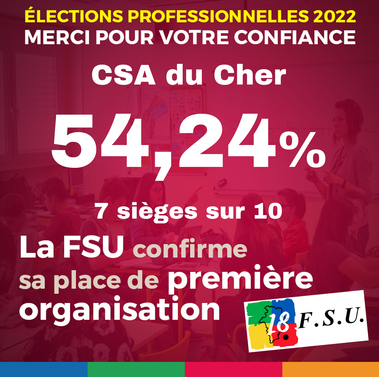 Vous avez été nombreuses et nombreux à soutenir la FSU et le SNES lors de ces élections professionnelles comme en témoignent les résultats qui nous confortent dans notre position de premier syndicat du second degré. Pour cette confiance et pour cette implication à faire vivre notre syndicat, nous vous remercions.