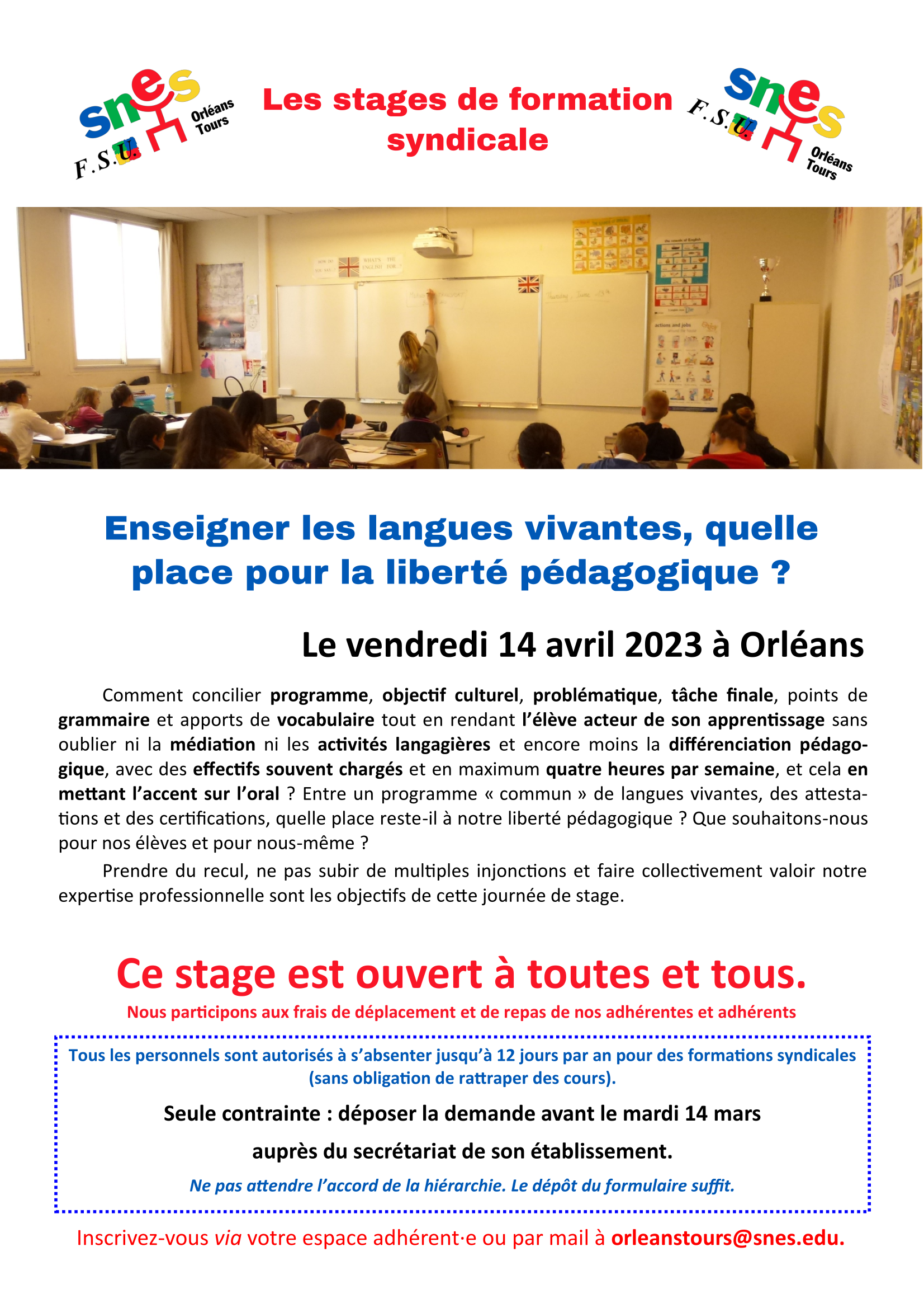 Vous êtes ici : Accueil Formations syndicales Stages syndicaux antérieurs Stages de formation syndicale 2022-2023 Enseigner les langues vivantes, quelle place pour la liberté pédagogique ? 12 mars 2023 Formations syndicales Enseigner les langues vivantes, quelle place pour la liberté pédagogique ? Partager cet article : Pour participer, la demande d’autorisation d’absence est à déposer avant le 14 mars :