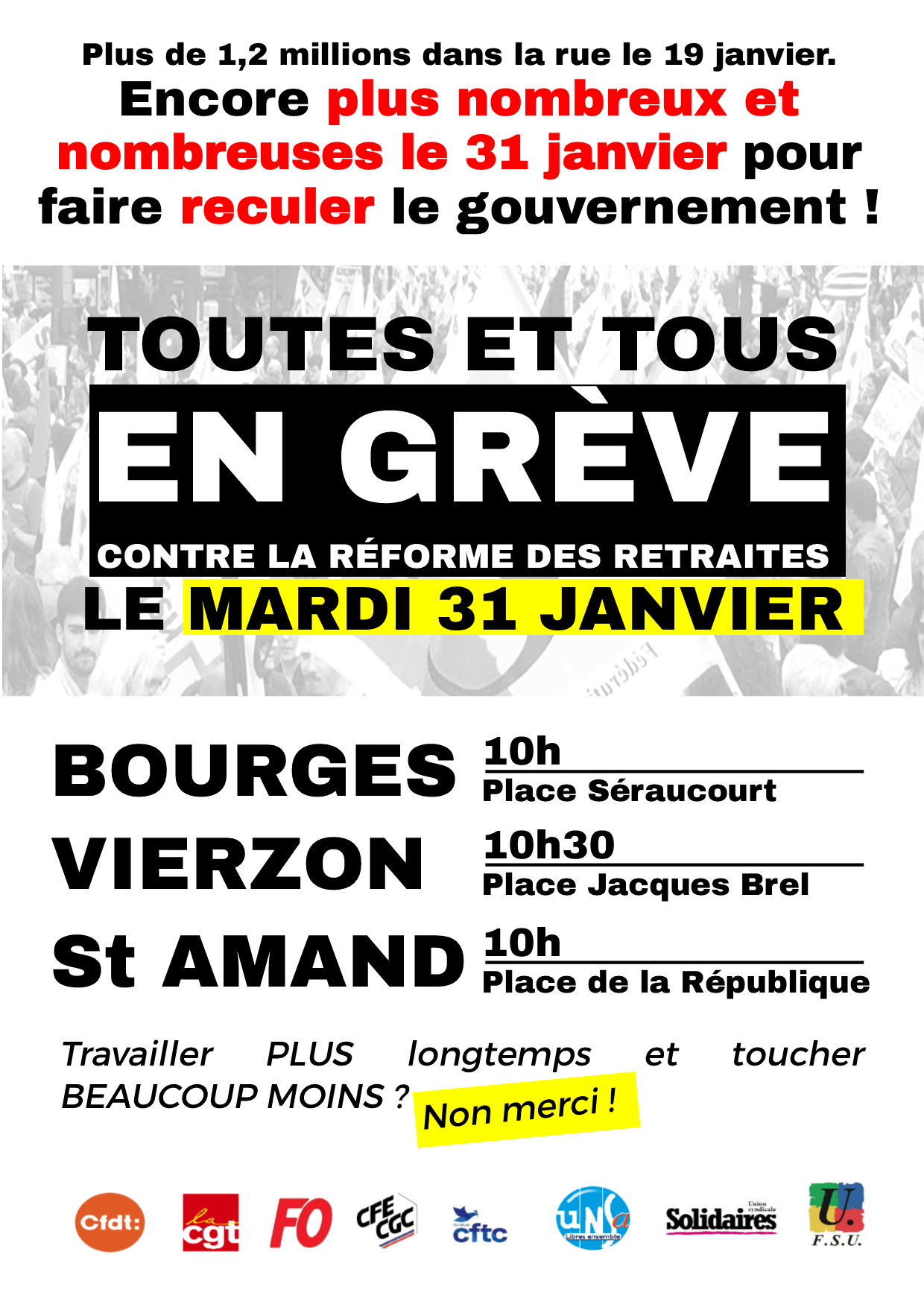 après une grève très bien suivie le 19 janvier avec près de 12 000 manifestants dans le Cher et 1,2 millions en France, l’intersyndicale a décidé de reconduire une nouvelle journée de mobilisation le mardi 31 janvier 2023.
