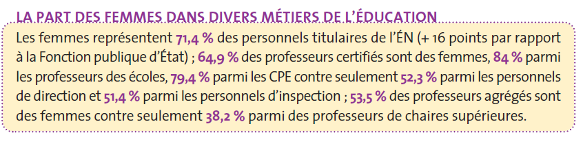 Ainsi, 87,4 % des femmes peuvent faire des heures supplémentaires contre 94,3 % des hommes. De plus, leur montant pour un homme est de 27 % supérieur à celui des femmes qui en bénéficient. Pour les enseignants à temps complet, le service hebdomadaire total en 2019 est de 18,9 heures, dont 1,8 HSA pour les hommes et de 18,6 heures, dont 1,4 HSA pour les femmes. À noter que le nombre d’HSA ne cesse d’augmenter depuis la rentrée 2015.