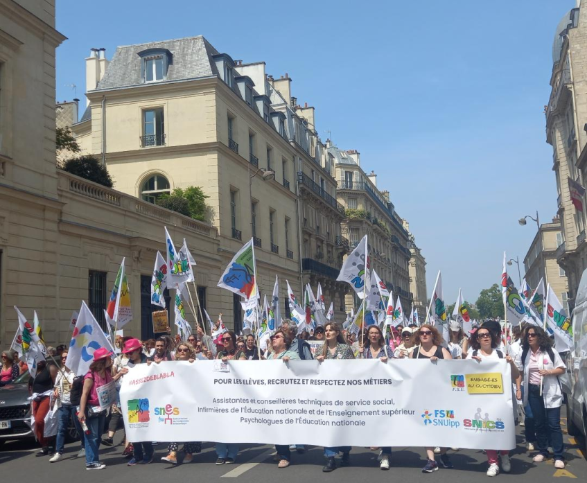 Ce sont les raisons pour lesquelles les PsyEN se sont mobilisé.e.s le mardi 10 juin à Paris à l’appel des syndicats de la FSU (SNES-FSU pour les PsyEN EDO, FSU-SNuipp pour les PsyEN EDA, SNICS-FSU pour les infirmier.e.s, SNUAS-FP pour les AS) avec les infirmier.e.s et les assistant.e.s de service social car le compte n’y est pas !
