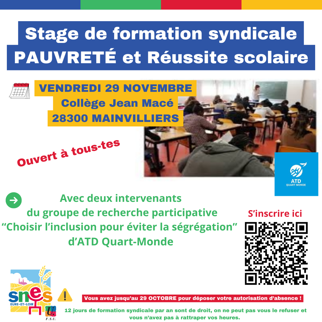 Vendredi 29 novembre 2024, au Collège Jean Macé de Mainvilliers, deux intervenantes travaillant dans un groupe de réflexion d’ATD Quart-Monde nous aideront à voir plus clair sur les questions qui lient pauvreté et réussite scolaire.