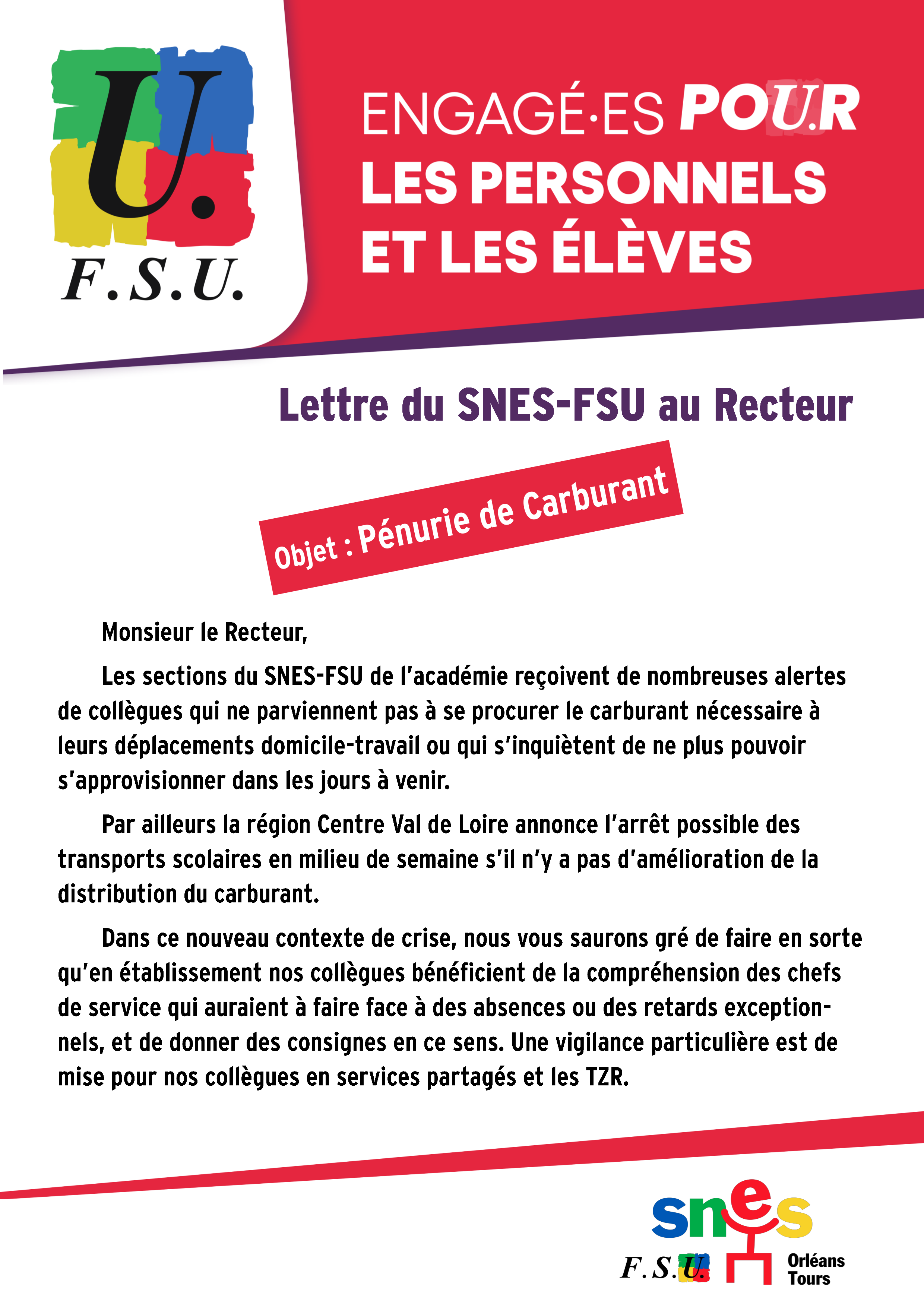Si vous rencontrez des difficultés pour vous rendre sur votre lieu de travail en raison de la pénurie de carburants, prévenez par mail votre chef d’établissement. Alertez également votre section académique en cas de pression (retrait sur salaire etc). : orleanstours@snes.edu ou par téléphone au 02 38 780 780.