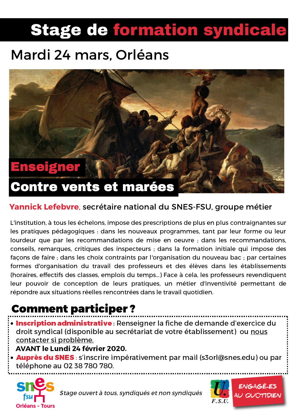 La section académique du SNES-FSU Orléans-Tours a le plaisir de vous convier à un stage de formation syndicale : Enseigner contre vents et marées, le 24 mars, à Orléans (accueil à partir de 9h au 29 boulevard Rocheplatte, Orléans).