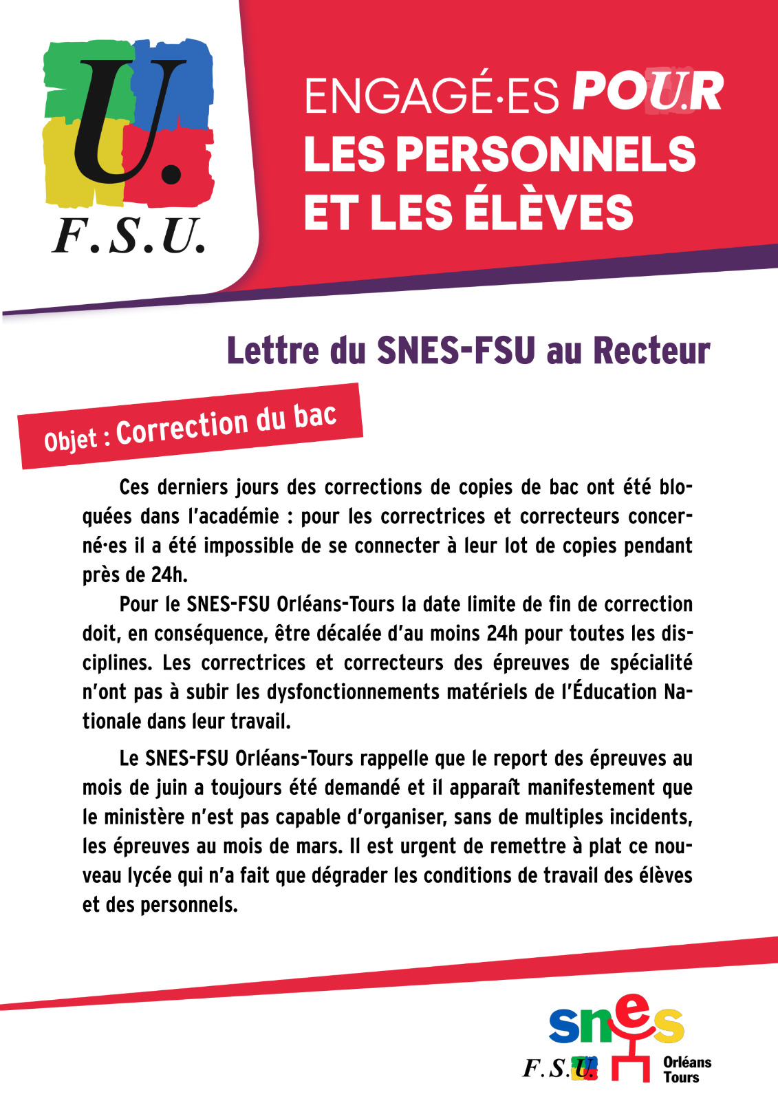 Pour le SNES-FSU Orléans-Tours la date limite de fin de correction doit, en conséquence, être décalée d’au moins 24h pour toutes les disciplines. Les correctrices et correcteurs des épreuves de spécialité n’ont pas à subir les dysfonctionnements matériels de l’Éducation Nationale dans leur travail.